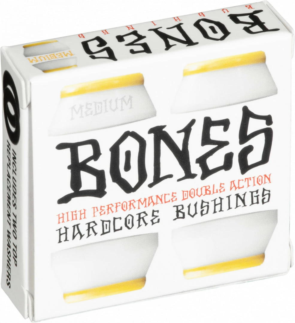The HardCore insert in the center of BONES bushings connects the two sides of each bushing together by bonding them to the HardCore insert. When the hanger web squeezes one side of a HardCore bushing, that side of the bushing reacts just like a normal bushing, but the chemical bond between the HardCore and the cushion keep the bushing from being squeezed out the other side. It actually increases the resistance to turning because it is held in place by the HardCore insert. This means basically that BOTH sides of the BONES HardCore Bushing are resisting your turning force. That’s why we call BONES Bushings the first double action truck bushings.