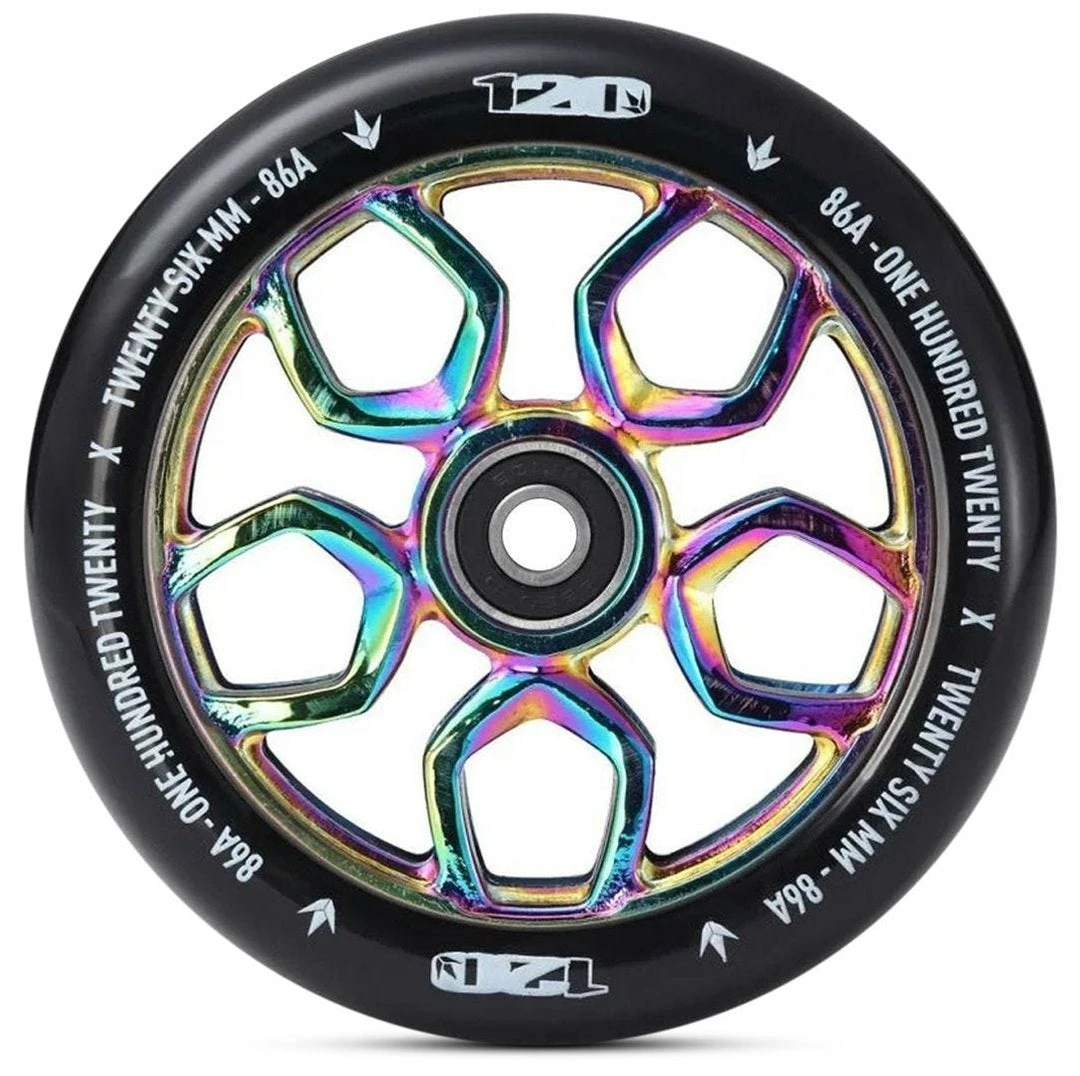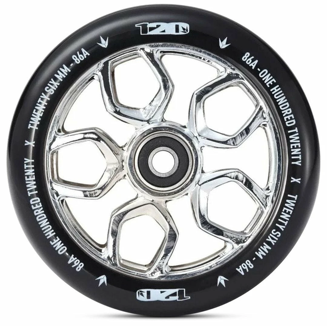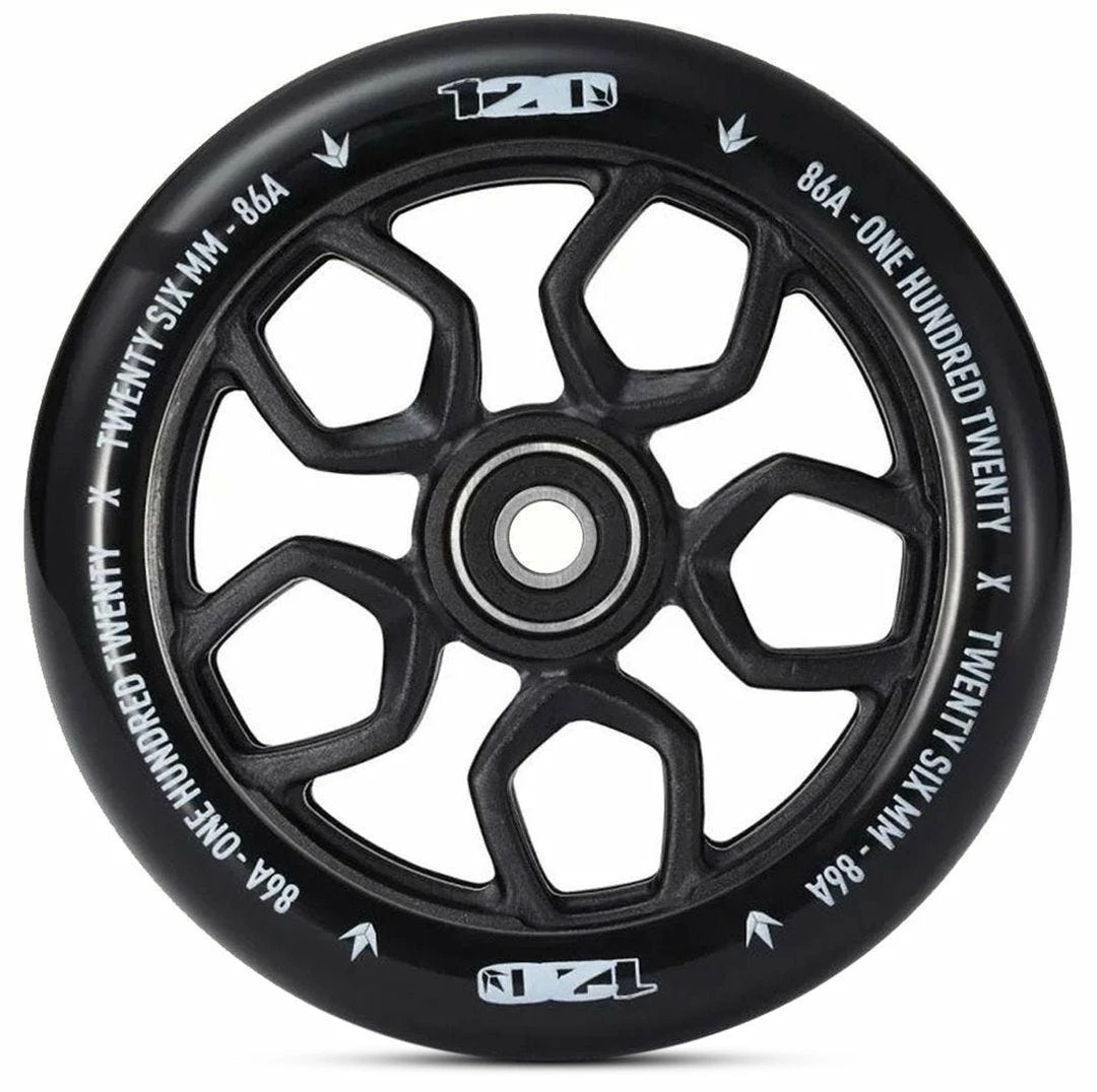 ​The Envy Lambo 120mm pro scooter wheel comes with a 26mm wide urethane that provides more grip in corners. 86A durometer urethane provides a softer feel and extra grip so it keeps you from sliding aorund at the skatepark.The wider urethane on this wheel makes it a little difficults to install on your fork; please be careful with installation. These Envy Lambo 120mm scooter wheels are sold individually and INCLUDE ABEC 9 bearings. Keep in mind that these wheels are bigger than your average wheel so they might not fit on any scooter.