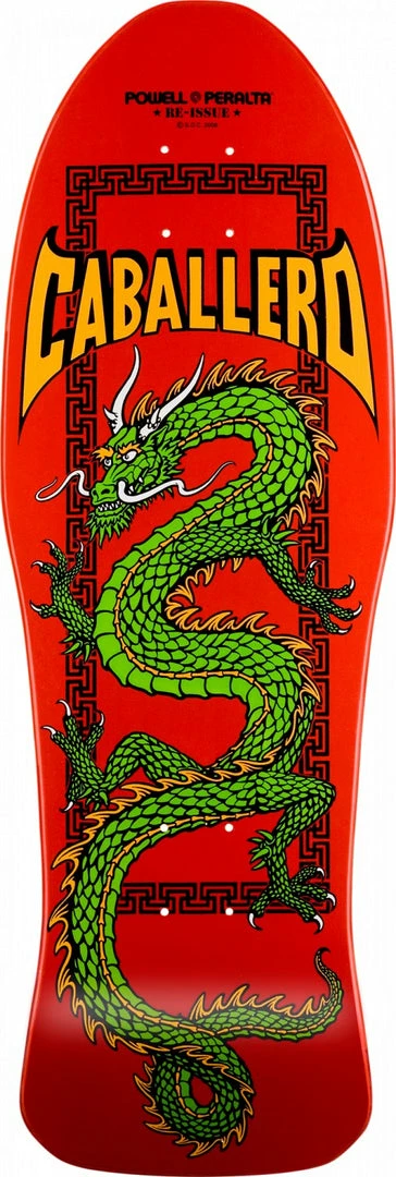 After a six year run, it was time to change up Caballero’s deck graphic. Just in time for the filming of the Animal Chin video in 1986, a new dragon graphic was created for Cab. Now known as the Cab Chinese Dragon, the artwork was inspired by a Chinese takeout box and finally illustrated by VCJ. The Chinese Dragon came on a new “fish” shape in full size and mini. It was produced as 7-ply maple and also “Bonite” construction. It was discontinued in 1987.