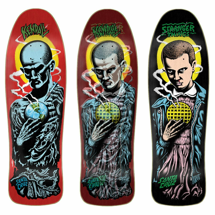 Santa Cruz Skateboards X Stranger Things Kendall Eleven Upside Down Re-issue deck with spot gloss graphic print on 7 ply North American Maple pressed individually using epoxy making a strong, responsive deck with long lasting pop and consistent concave and kick.